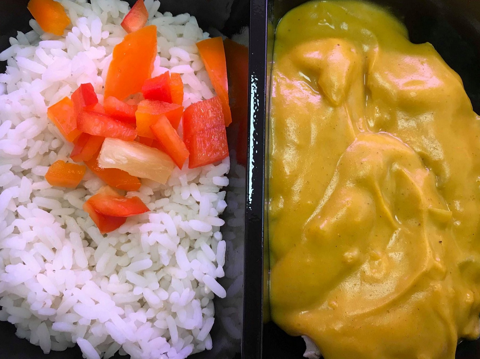 Marinated chicken breast in a smooth curry sauce. Served with rice.