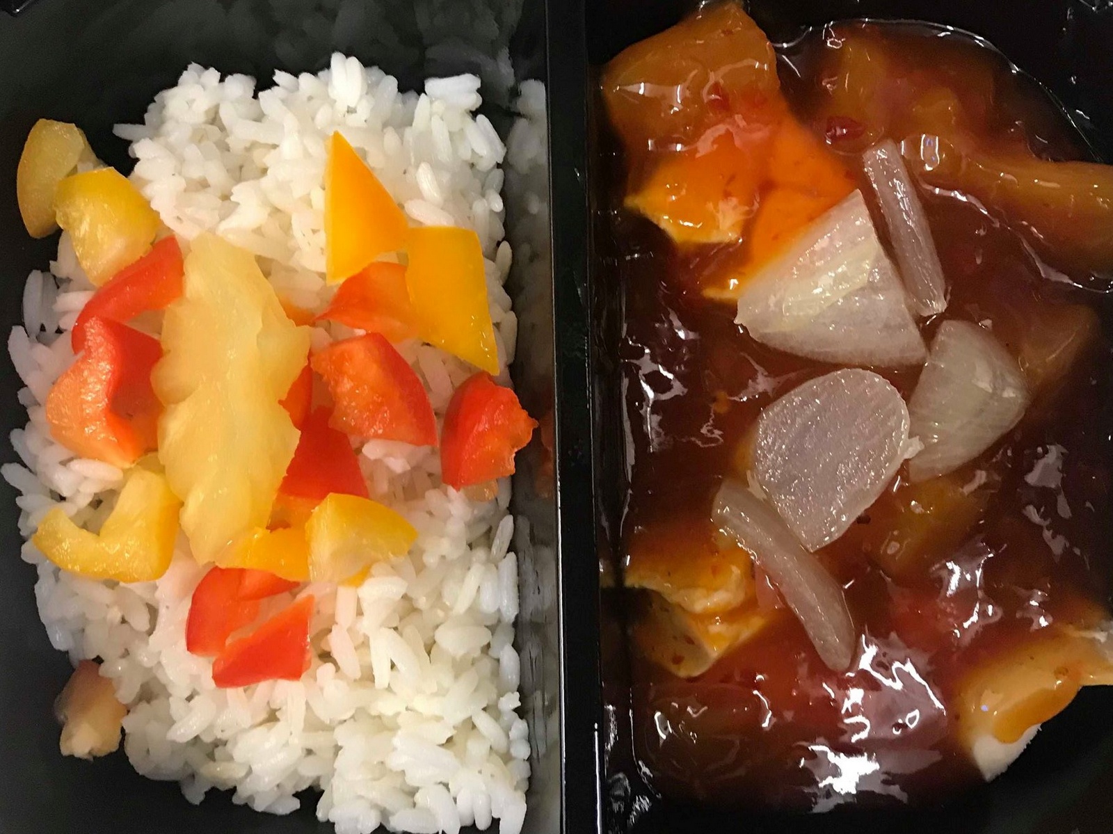 Marinated chicken breast cooked in a sweet & sour sauce. Served with rice.