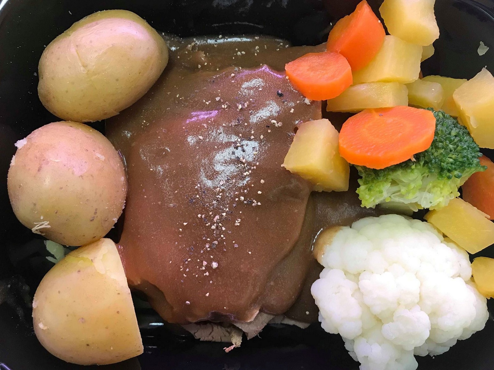 Slices of in Lamb in a rich meaty gravy. Served with seasonal veg.