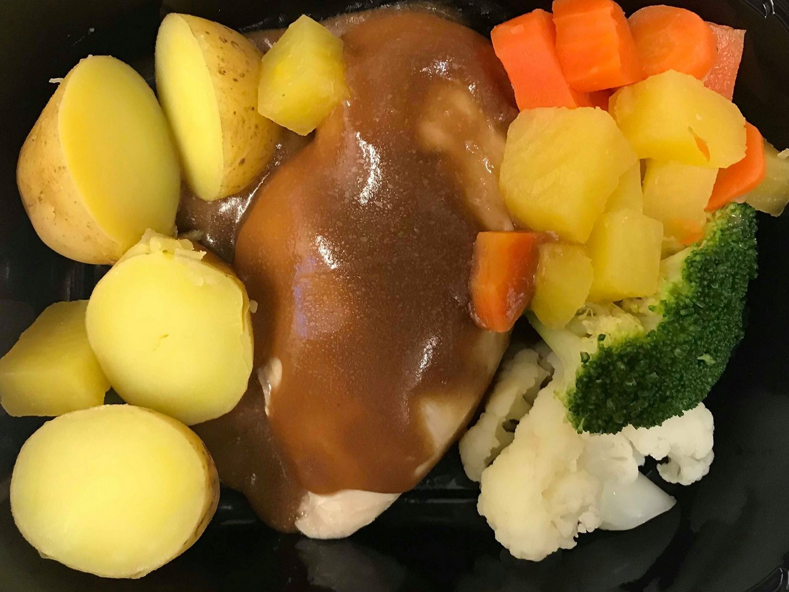 Breast of chicken in a rich Chicken gravy. Served with seasonal veg.