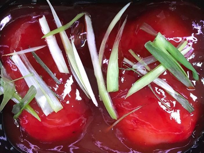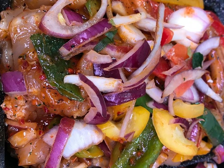 Diced chicken marinated in a lemon, chilli & ginger marinated with mixed peppers, red onion.
