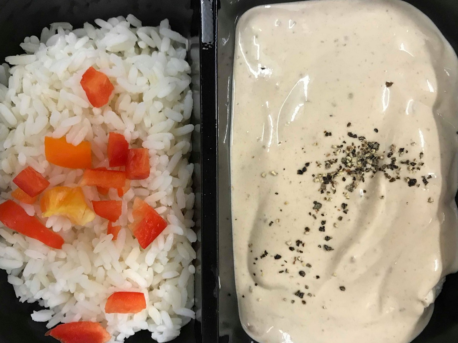 Chicken breast in a creamy peppercorn sauce. Served with rice.