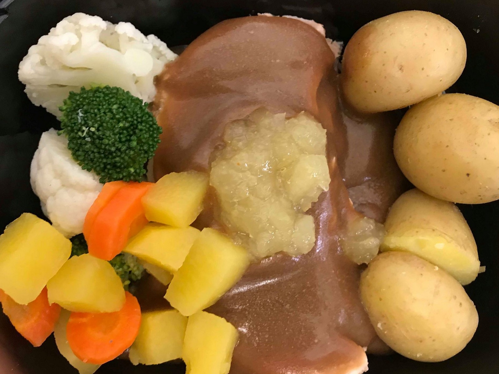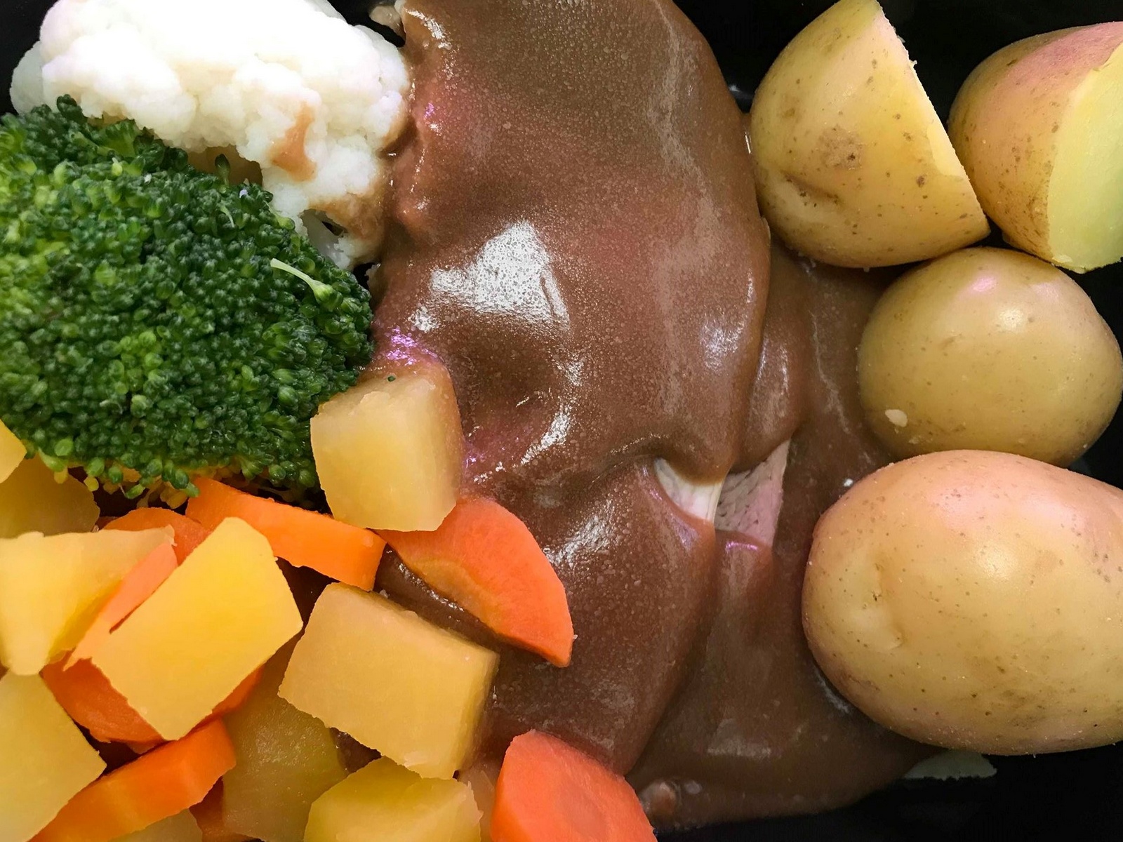 Slices of in Lamb in a rich meaty gravy. Served with seasonal veg.