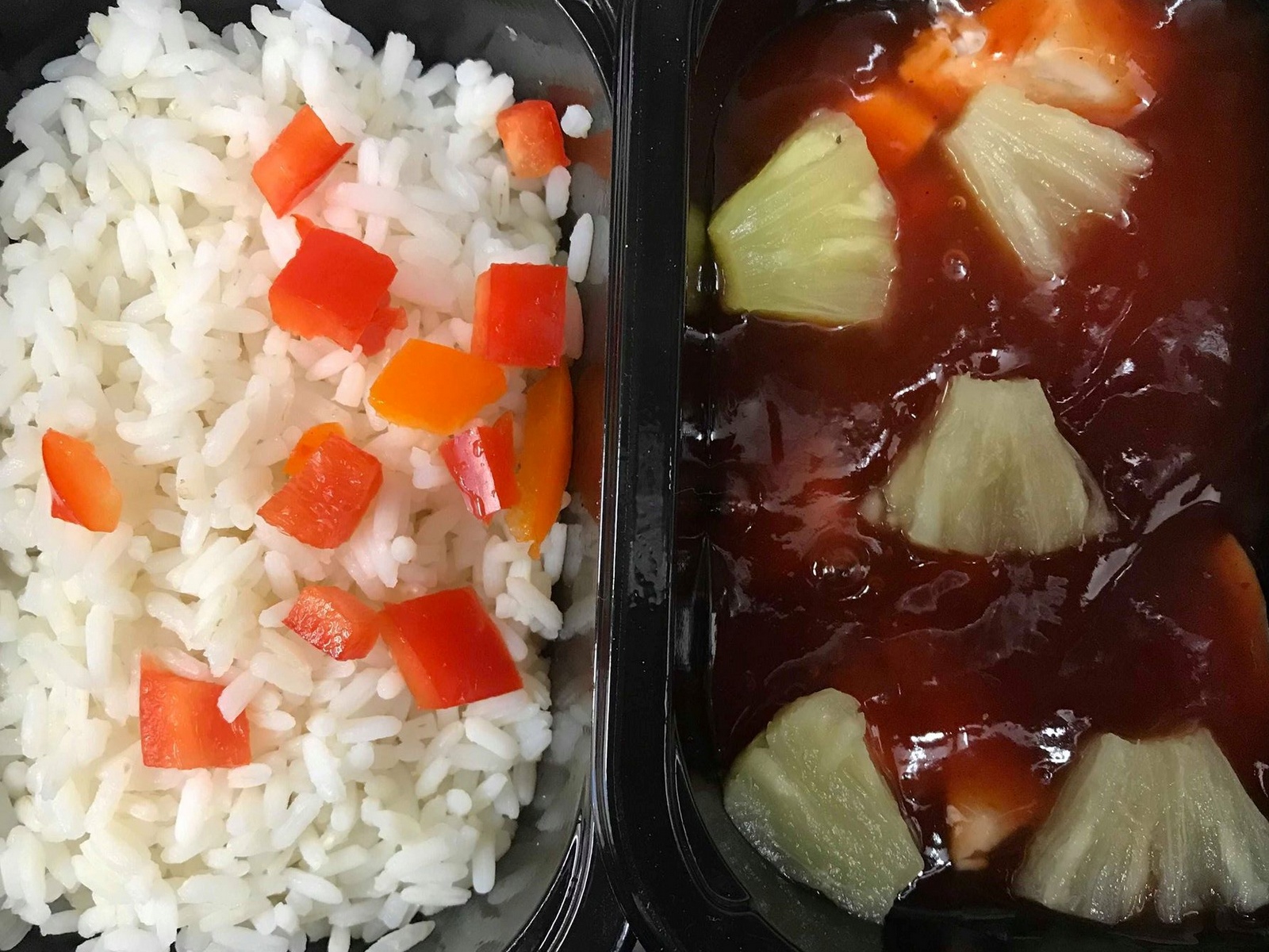 Marinated chicken breast cooked in a sweet & sour sauce. Served with rice.